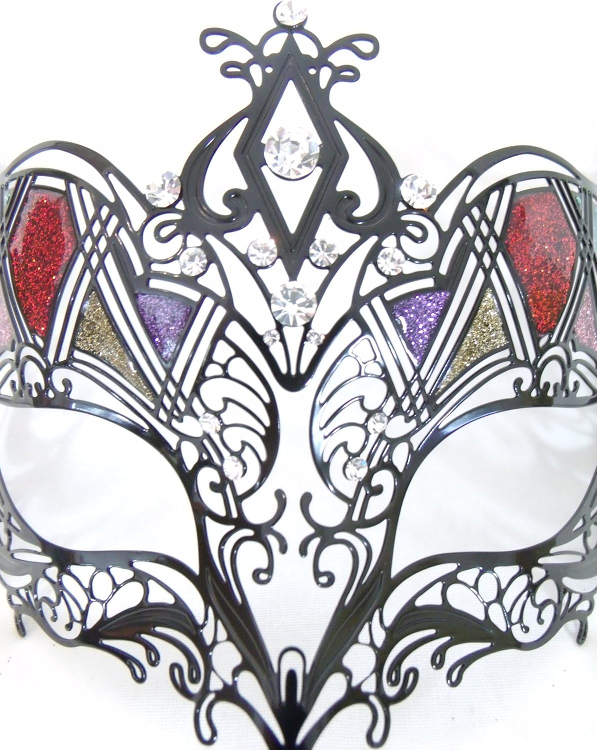 Hand made Venetian "Metallo Strass Colore" mask from Venice, Italy. This is a high quality collectible mask from one of the top mask designers in Venice, Italy. A gorgeous black laser cut metal mask. Mask is black metal with multcolored glitter segments. Swarovski crystals decorate and accent this already stunning mask. Mask has black satin ties for easy wearing. Mask size: 6 1/2 inches wide by 4 inches high The mask comes with a tag guaranteeing the authenticity from the artist in Venice. After worn, display as a magnificent art piece.