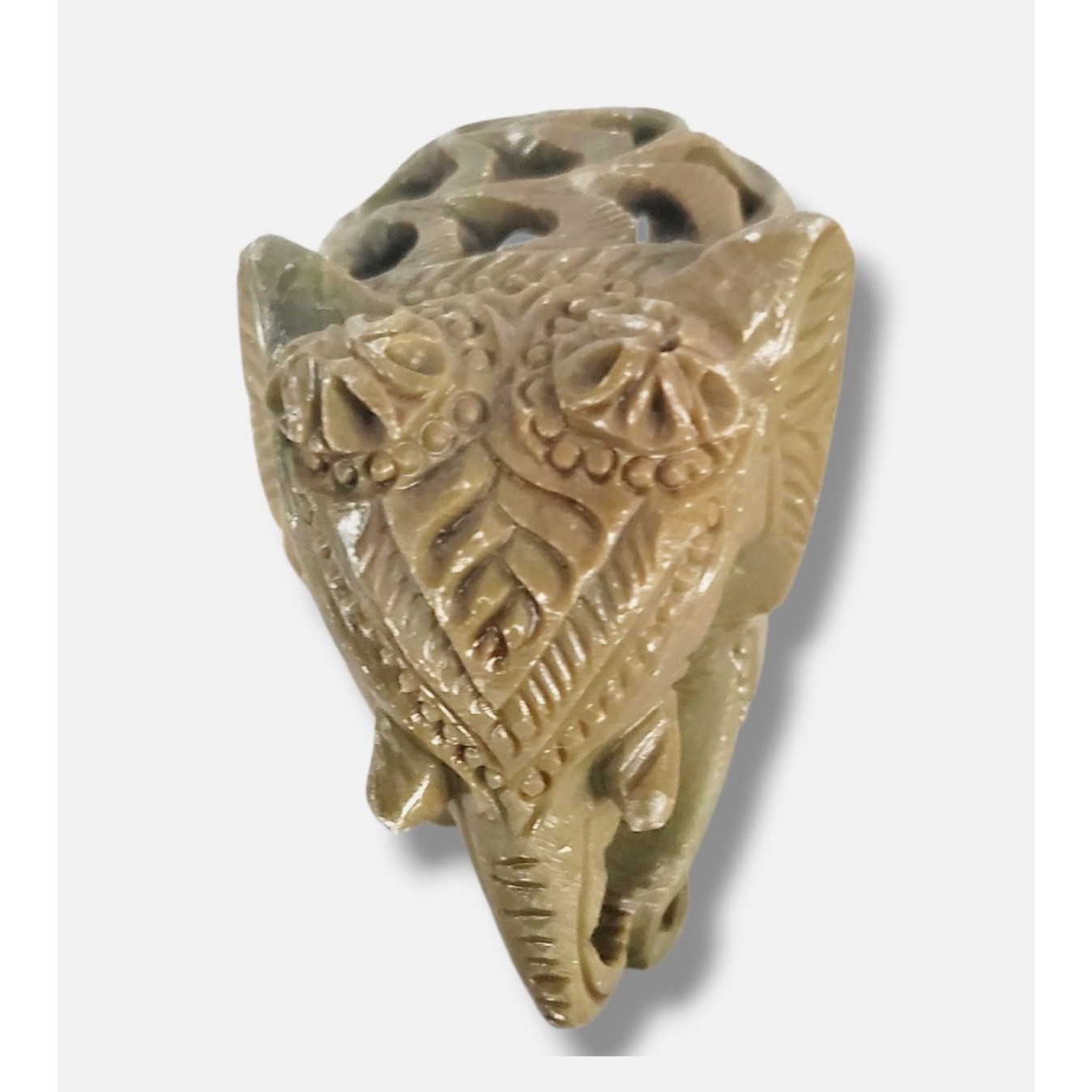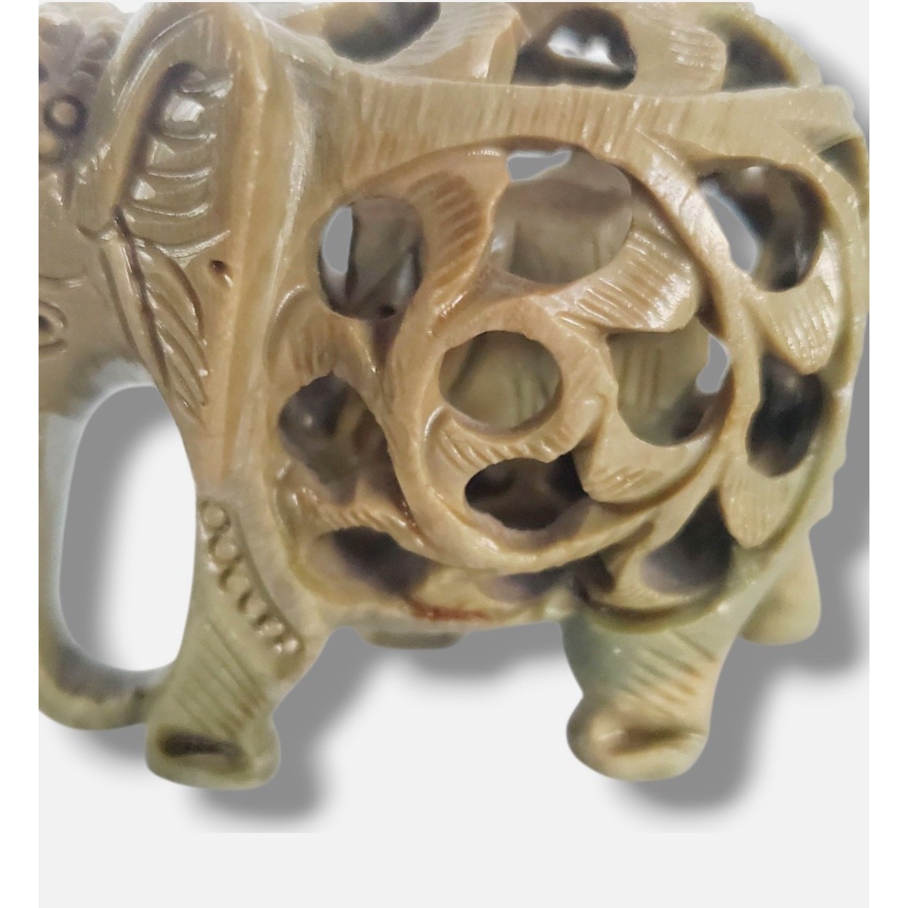 This hand-carved soapstone elephant statue from India features intricate carvings and a polished finish, making it a unique and artistic addition to any collection. The white color and animal subject of the statue make it a versatile piece that can be easily cleaned and maintained with simple cotton cloth. Measuring 5"x7" inches, this statue captures the beauty and strength of elephants in a charming and detailed design. Perfect for animal lovers or collectors, this handmade piece is sure to be a conversation starter in any home decor setting