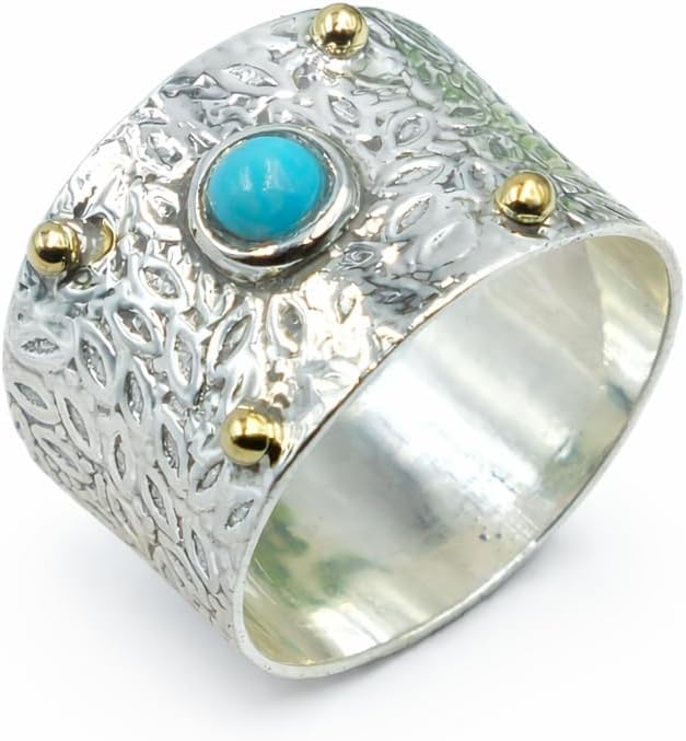 This handmade statement ring features a striking Arizona turquoise gemstone set in 925 sterling silver with warm brass accents, creating a bold contrast that highlights the stone’s natural character. The wide band is hand-hammered to give it an organic texture, adding depth and a distinctly artisanal feel to the design. Known for its vivid blue tones and natural matrix patterns, Arizona turquoise brings a sense of earthy elegance and individuality to the ring. The combination of mixed metals and a substantial band makes this piece eye-catching yet versatile, perfect for those who appreciate distinctive jewelry with a handcrafted soul.》Product Details:- Product - Ring Metal - Pure 925 Sterling Silver And Brass Stamp - 925 Gemstone - Arizona Turquoise Gemstone Color - Blue Gemstone Shape - Round Gemstone Treatment- No Treatment (Natural) Product Weight – 9.00gm Approximate 》About Product:- Our products are completely handmade and made of pure 925 sterling silver and natural gemstones, so don't worry about the product, 100% customer satisfaction guaranteed. 》Please Note:- Because it is a natural gemstone, some slight variations in color and pattern are expected. 》Thank you for visiting my shop!