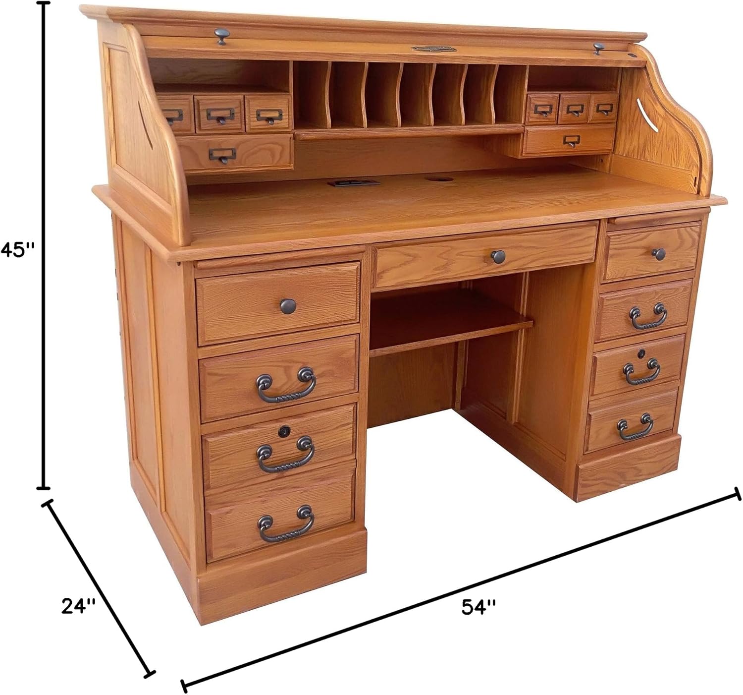 Solid Oak Roll Top Desk 54"W x 24"D x 45"H Vintage Styling -turn of the century look -25 drawers to organize your office space and files. Two deep file drawers with heavy duty metal extension glides Locking file drawers Solid Wood tambour with full canvas underneath and key lock Two pull out writing tablets Generous work space writing surface Solid Oak Pencil Organizer in Felt Lined Center Drawer Solid wood raised panels on sides. Dove-tailed drawers on all base drawers with additional metal runner system for heavy duty use. Electrical plug in unit with 2 USB ports built in to desk surface. Easy to assemble. Top Hutch completely assembled. Base constructed of two drawer pedestals with back panel and center drawer unit. Knee hole Space 23"Wx26"Dx25"H Available in Solid Oak with Harvest stain. Solid Wood Dovetailed Drawer construction on all seven base drawers Easy Assembly Solid Oak with Harvest stain. Good choice for any room in your home - work space disappears when the roll top is down. Neat and Clean.