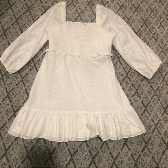 Veronica Beard Off White Eyelet Denise Mini DressSquare neck and backBracelet length puff sleeves with elastic cuffsSmocked bustBack cutout detailBack zip closureFlare skirtFlounce hemMini length100% cottonNew With Tag If you want it, feel free to make a reasonable offer.